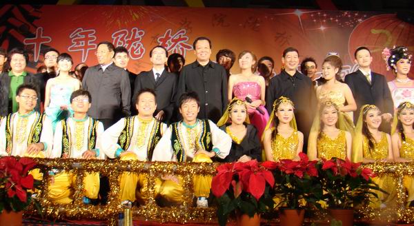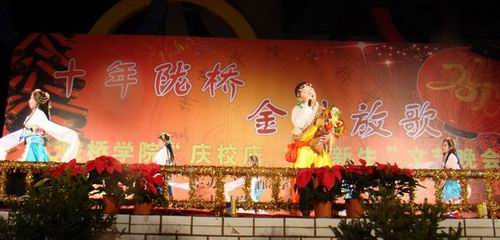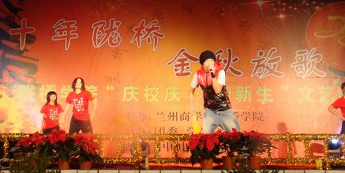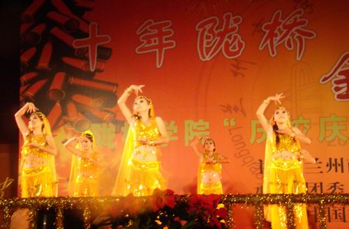 晚会演出前,完颜弟院长发表了热情洋溢的校庆祝辞。他说,在这个收获的季节里,我们共同迎来了学院10周年的生日,这是陇桥发展史上的一个里程碑,是所有陇桥人光荣与梦想的盛典。完颜院长说,十年前的今天,学院人凭着一腔热血在雁滩撒下了萌发的种子,开始租房办学,如今已经成长为拥有国际经济与贸易系等8个系37个本科专业和方向,近10000名学生和近400人素质良好的师资队伍,已经为国家培养了8300多名合格的大学毕业生并在社会上赢得良好的声誉。完颜院长强调,面对新的挑战和机遇,我们要在《国家中长期教育改革和发展纲要》的指引下,在国务院批准的《关于进一步支持甘肃经济社会发展的若干意见》(即47条)政策的支持下,抢抓机遇、乘势而上,推动我院的办学质量、教学、科研及服务社会的能力提高到一个新的层次。在祝辞中,完颜院长从教师、学生两个层面提出了希望和要求:希望教师严谨笃学,爱岗敬业,以真情、真心、真诚教育和影响学生,以人格魅力和学识魅力教育和感染学生,努力成为学生的良师益友和学生健康成长的指导者和引路人;希望广大同学学会求知,成为一个勤学善思的陇桥人;学会做人,成为一个有责任感的陇桥人;学会处事,成为一个有务实精神的陇桥人。