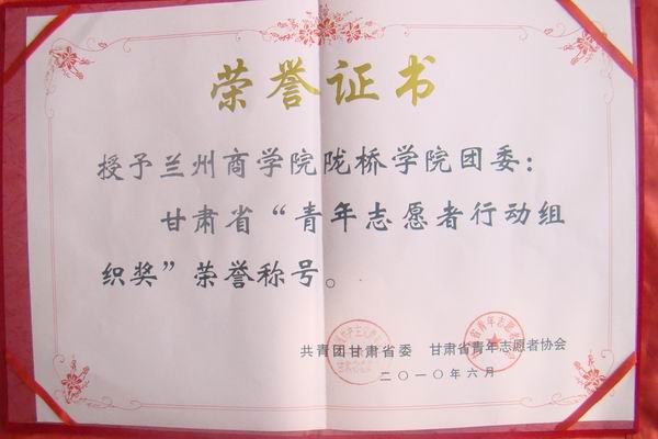 我院团委荣获首届甘肃省“青年志愿者行动组织奖”;我院“自强之星”行动项目荣获首届甘肃省“青年志愿者行动项目奖”;我院青年志愿者协会荣获首届甘肃省“优秀青年志愿服务集体”荣誉称号;团委书记马义哈同志荣获首届甘肃省“青年志愿者行动贡献奖”;青年志愿者协会主席张燕鹏、自强社团社长刘楠等两名同学荣获首届甘肃省“优秀青年志愿者”荣誉称号。