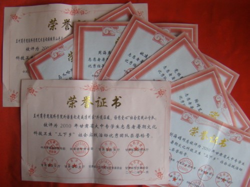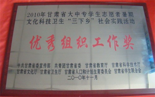 日前,中共甘肃省委宣传部、共青团甘肃省委、甘肃省教育厅、甘肃省人口和计划生育委员会、甘肃省文化厅、甘肃省科学技术厅、甘肃省卫生厅、甘肃省学生联合会等8部门联合表彰了2010年甘肃省大中专学生志愿者暑期文化科技卫生“三下乡”社会实践活动先进集体和先进个人。