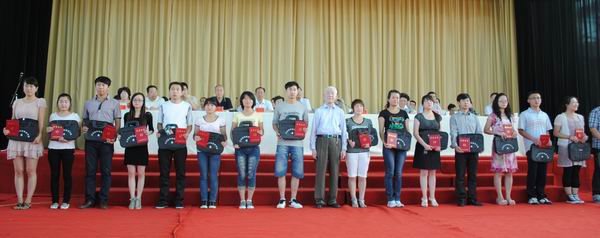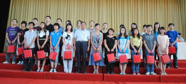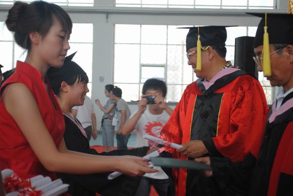 完颜弟院长、魏立智副院长及教授委员会代表为毕业生正冠拨苏并发放学位证、毕业证。陆兆兴副院长和李韫章副书记分别为27名考研学生和优秀毕业生代表颁发荣誉证书及奖品,并与每一位毕业生合影留念。