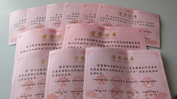 日前,中共甘肃省委宣传部、共青团甘肃省委、甘肃省教育厅、甘肃省人口和计划生育委员会、甘肃省文化厅、甘肃省科学技术厅、甘肃省卫生厅、甘肃省学生联合会等8部门联合表彰了2011年甘肃省大中专学生志愿者暑期文化科技卫生“三下乡”社会实践活动先进集体和先进个人。