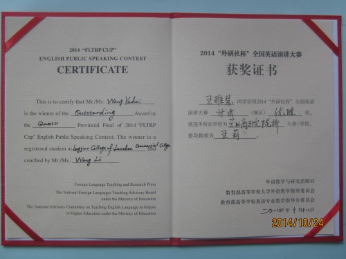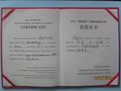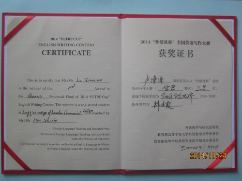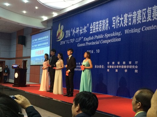 2014“外研社杯”全国英语演讲、写作大赛(甘肃赛区复赛)于10月18日在河西学院圆满结束。我院外国语言文学系2012级英语(英语教育方向)本科二班卢潇潇、2013级英语(国际商务英语方向)本科班姚宏璐分别荣获2014“外研社杯”全国英语写作大赛(甘肃赛区复赛)三等奖;经济贸易系2014级经济与金融本科班王雅慧、外国语言文学系2014级英语(国际商务英语方向)本科班学生张岳山分别荣获2014“外研社杯”全国英语演讲大赛(甘肃赛区复赛)优胜奖。