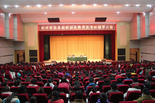 2014年12月22日下午16:30,经济贸易系在学术报告厅召开了创新创业教育及考研辅导大会。学院教学总监樊元教授,院长助理、教务处处长高军,系主任刘伟,党总支书记康昱明,副主任王媛,全体辅导员老师及经济贸易系2014至2012级全体学生共600余人参加了大会。大会由系主任刘伟主持。