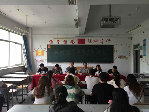 按照学院2014-2015学年第二学期期中教学检查的总体要求,我系于5月19日(星期二)下午4:30,召开了“经济贸易系期中教学检查学生座谈会”。本次会议由系主任刘伟主持,党总支书记康昱明、副主任王媛、教学秘书、全体辅导员参加座谈会。