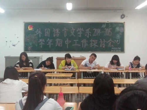 5月18日外国语言文学系召开了2014—2015学年第二学期期中团学工作探讨会,出席会议的有外语系团总支书记蔡婧婧,参加会议的有外语系主席团成员、各部部长、副部长及各班班委。