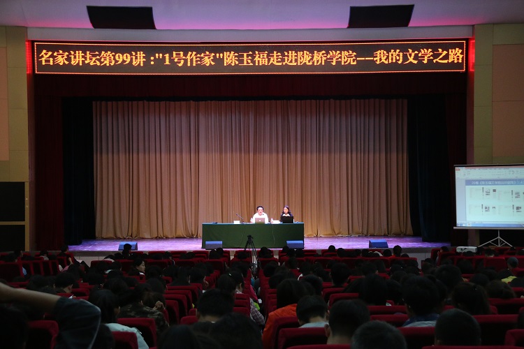 5月8日下午,陇桥学院名家讲坛第九十九场讲座在学术报告厅举行。著名作家、享誉文坛的“1号作家”、中国作家协会会员、甘肃省作协副主席、国内多所大学特聘(客座)教授陈玉福先生应邀作了题为“我的文学之路”的专题报告。学院副院长高军出席并主持了报告,师生代表共800多人参加了本场报告。