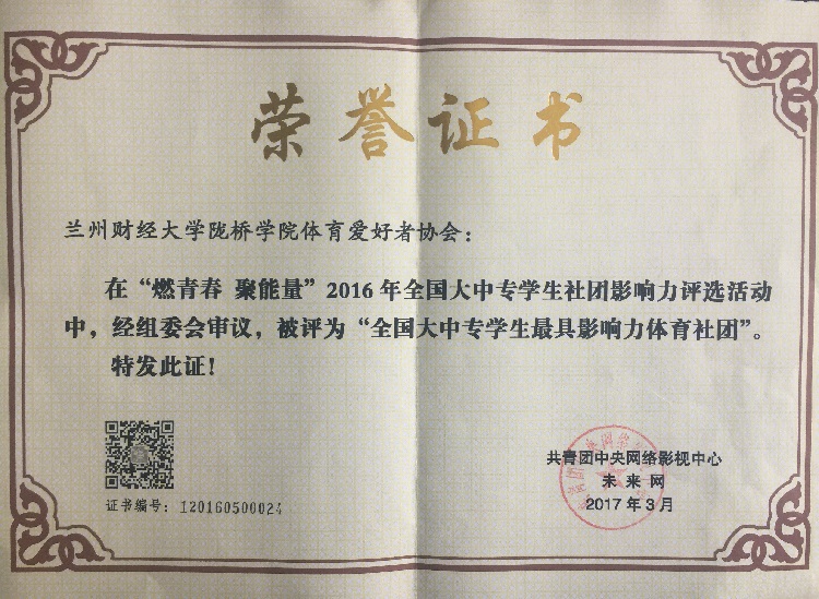 近日,共青团中央网络影视中心公布了“燃青春 聚能量”2016年全国大中专学生社团影响力评选结果,陇桥学院体育爱好者协会在评选活动中脱颖而出,荣获“全国大中专学生最具影响力体育社团”荣誉称号。