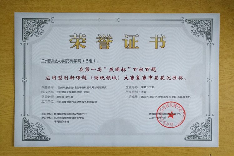 近日,首届教育部“百校百题”应用型创新课题(财税领域)大赛复赛(大赛区)在西北工业大学拉开序幕。陇桥学院 “百校百题”课题《兰州阜康金瑞斯柯达4S店增值税税收筹划问题研究》在校内导师、企业导师和同学们的共同努力下脱颖而出,获得优胜奖,学院也是甘肃省内唯一一所获奖的民办院校。