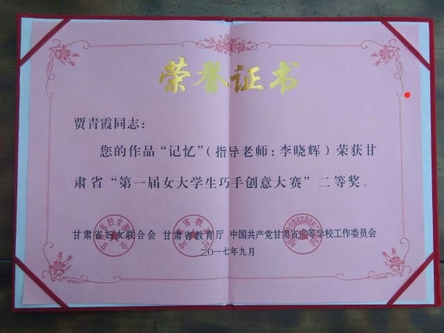 近日,由省妇联、甘肃省教育厅、省高校工委联合举办的第一届女大学生巧手创意大赛圆满结束,由李晓辉老师指导的贾青霞同学的作品《记忆》获得省级二等奖(奖金3000元)。我院艺术设计系有4件作品获得本次比赛优秀奖(奖金500元)。