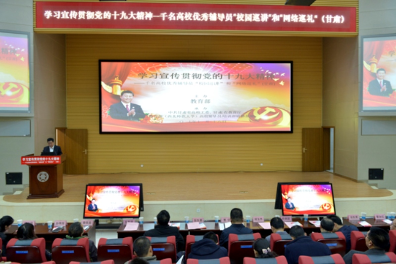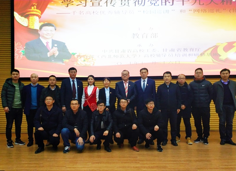 11月26日,由教育部思想政治工作司主办,甘肃省高校工委、甘肃省教育厅、教育部(西北师范大学)高校辅导员培训研修基地承办的“学习宣传贯彻党的十九大精神——千名高校优秀辅导员“校园巡讲”和“网络巡讲”活动在西北师范大学新校区毅然学术报告厅举行,学院由学生处处长郇东带队,和学生处及部分辅导员老师参加了本次活动。