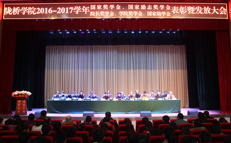 12月6日下午,陇桥学院“2016-2017学年国家奖学金、国家励志奖学金、院长奖学金、学院奖学金、国家助学金表彰暨发放大会”在学术报告厅隆重举办。董事会领导、学院领导出席了会议,各党总支负责人、全体辅导员老师及800余名学生代表参加了大会。表彰大会由省教育厅督导专员、学院党委书记王新兰教授主持。