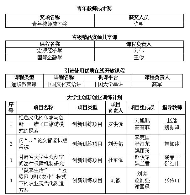 近日,甘肃省教育厅下发《关于公布2018年高等学校教学质量与教学改革工程和创新创业改革项目的通知》,我院共获青年教师成才奖1项,教学质量与教学研究改革工程项目3项,大学生创新创业训练计划项目获批立项4项。项目名单如下: