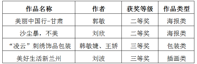 近日,我省第十届全国大学生广告艺术大赛暨“人文甘肃”高校师生艺术设计大赛落下帷幕。我院艺术设计系4名教师荣获“人文甘肃”艺术设计大赛奖项。