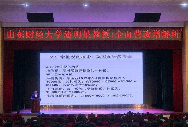 潘明星教授的报告以增值税征税范围引入,分析了中国过去的税种布局及流转税增、消、资、营四税并存交叉征税的模式,进而引出为什么要实行营改增。从增值税的概念、类型和计税原理出发,生动形象地为在场师生阐释营改增是供给侧改革的重要举措之一,解决了传统流转税全值征税带来的重复征税,有利于消除分工协作专业化生产的税制障碍。报告还从一般纳税人和小规模纳税人两个角度梳理了营改增的内容,用详实的数据为展现国家实施财税改革的效果,通过对不同行业、不同纳税人身份分析证明营改增不仅仅对建筑业、房地产业、金融业、生活服务业四个行业利好,是对所有行业减轻税负。