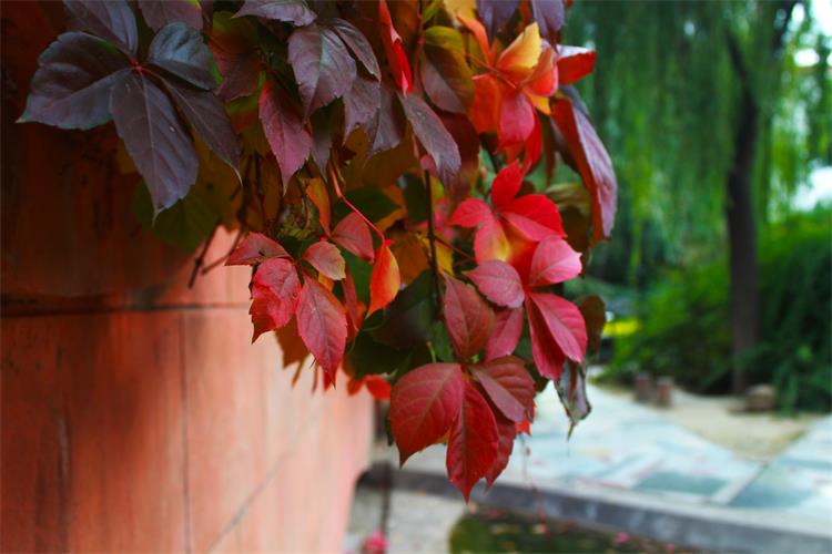 道旁,墙头上爬满了火红的爬山虎