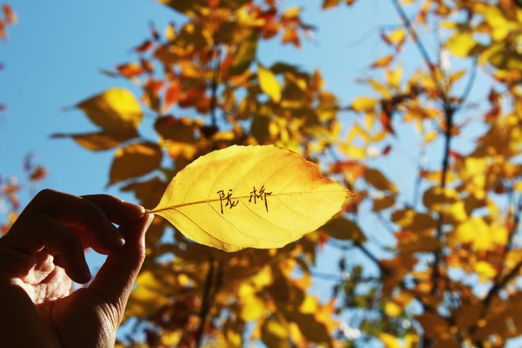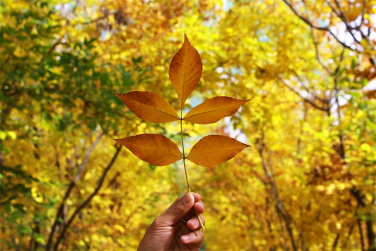 伸手接一片树叶,轻嗅秋天的芳香