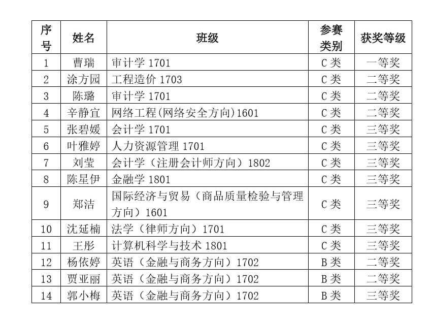 日前,全国大学生英语竞赛组织委员会公布了2019年全国大学生英语竞赛(NECCS)甘肃赛区获奖的名单,我院共有14名学生获奖,其中会计学系曹瑞同学获非英语专业类省级一等奖,其他获非英语专业类二等奖3项,三等奖7项;英语专业类二等奖2项,三等奖1项;外国语言文学系汪凤老师获得优秀指导教师奖,权志成老师荣获优秀组织奖。