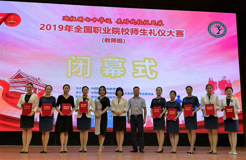 同期,梁磊老师受中国职业技术教育学会2019年全国职业院校师生礼仪大赛组委会邀请担任大赛专家评委,全程参与了礼仪知识竞赛、教师职业风采展示、教师礼仪说课比赛的裁判与观摩并代表大赛组委会为获奖选手颁奖。