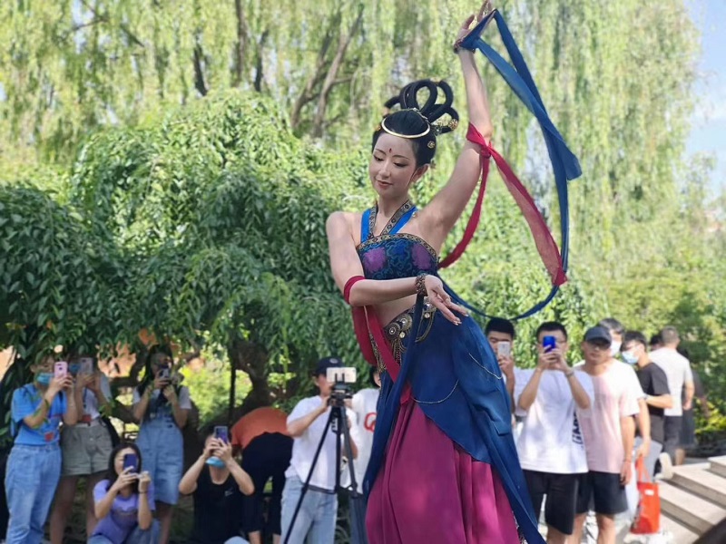 飞天舞者先后在学院图书馆、八角亭、运动场、学术报告厅等地点进行了丰富的表演。美丽的校园,热情的师生,以及飞天舞者姿态翩翩的表演,给广大师生呈现了一场丰富的视觉盛宴。