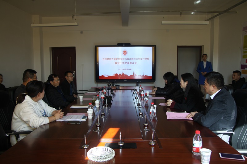 10月28日下午,学院与西北师范大学知行学院在科研楼三楼会议室举行就业交流座谈会。学院院长路文江,党委副书记、常务副院长马义哈与西北师范大学知行学院副院长董捷等一行12人参加了就业工作交流座谈会。就业指导服务中心负责人、各系党总支书记参加了座谈会,座谈会由马义哈主持。