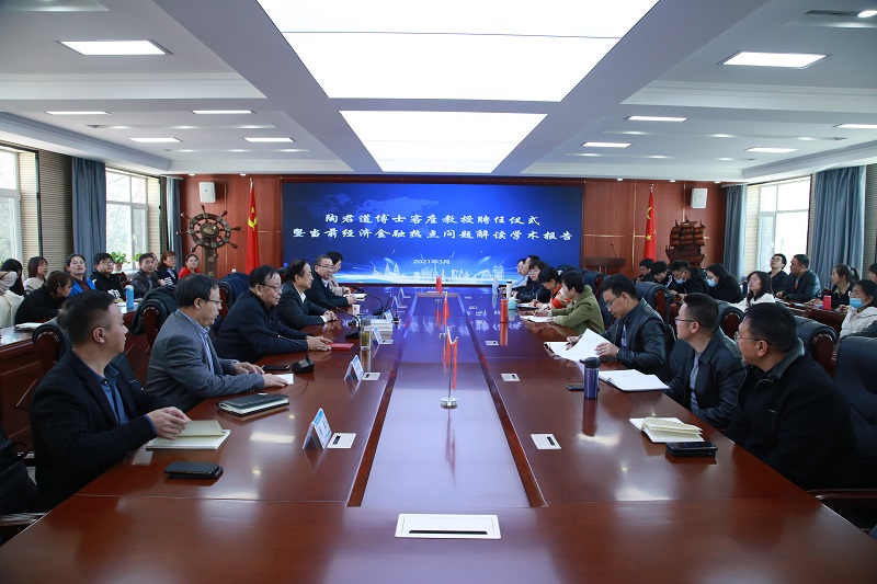 活动中,完颜弟校长为陶君道博士颁发客座教授聘书,陶君道博士为学校领导及与会师生赠送著作,并做了题为《当前经济金融热点问题解读》的报告。