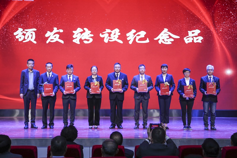 校长完颜弟研究员、常务董事陆兆兴研究员还为来校工作15年以上的教工颁发转设礼品,常务董事李晓光、陆昀同志为教工代表颁发转设纪念品。