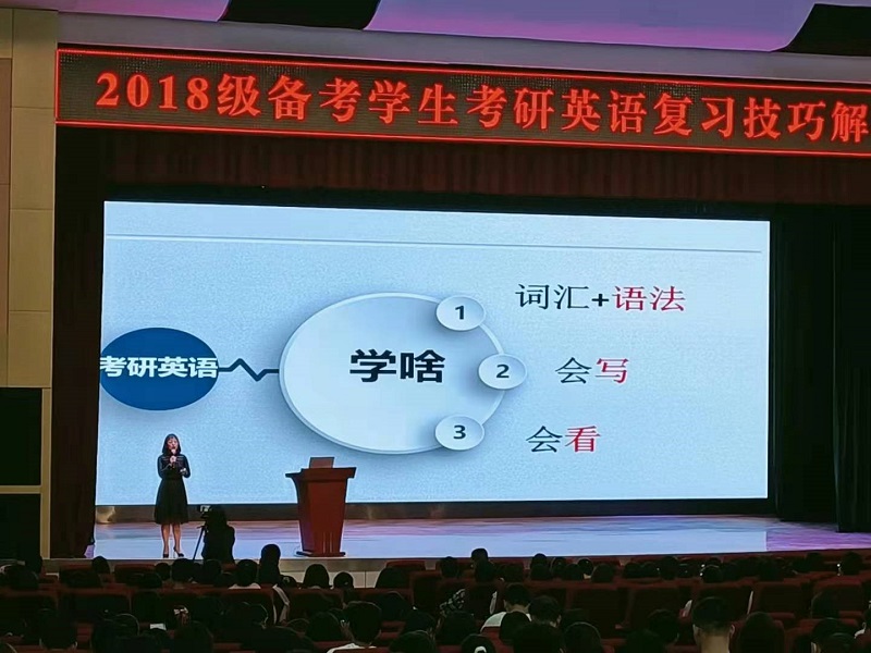 5月25日,学校邀请潍坊科技学院崔月霞老师为2018级考研备考学生做了一场题为“一研为定,一战成硕”的考研英语辅导报告会。报告会上,崔月霞老师结合自身多年指导学生考研的经历,从坚定学生的思想信念入手,她鼓励考研学生一定要相信信念的力量,树立考研的信心;她重点从考研英语词汇记忆、语法学习、写作等方面为学生分享了学习英语的技巧和方法,并勉励同学们只有持之以恒地坚持,才能收获别人收获不了的收获。