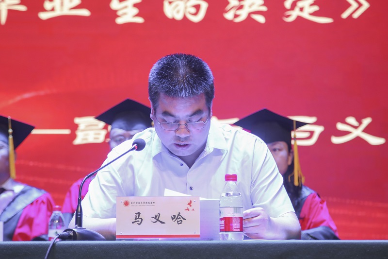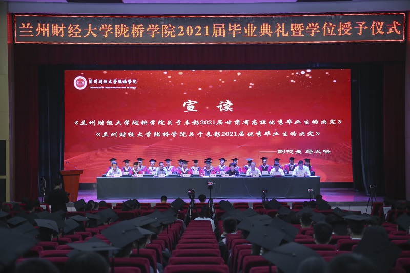 典礼上,马义哈宣读了《兰州财经大学陇桥学院关于表彰2021届甘肃省高校优秀毕业生的决定》和《兰州财经大学陇桥学院关于表彰2021届优秀毕业生的决定》;路文江为获得兰州财经大学陇桥学院2021届优秀毕业生代表颁发荣誉证书;完颜弟为获得甘肃省2021届优秀毕业生代表颁发荣誉证书,并宣读《关于授予董蓉等2521名本科毕业生学士学位的决定》。