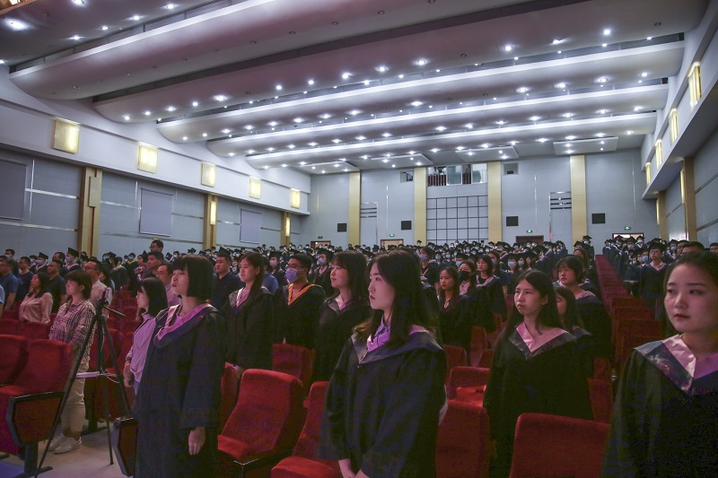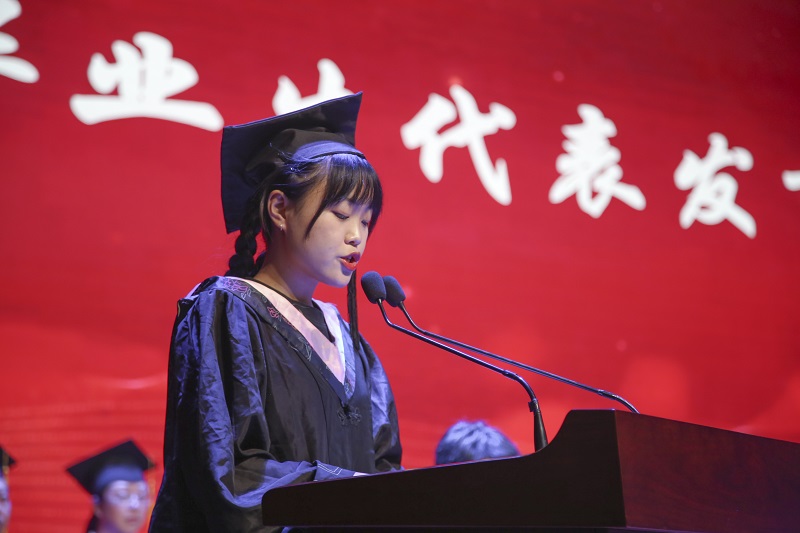 优秀毕业生代表、会计学院考取华中师范大学硕士研究生的杨春晓同学发言。她对母校搭建的舞台、老师的辛勤培育、父母的大力支持、同学的相互陪伴表示感谢,对即将离别的母校充满眷恋。她号召同学们,在未来前行的日子中要谨记母校厚德载物,博学济世的校训,严格自律、踏实做人、戒骄戒躁、认真做事,带着对社会的责任感,为国家的发展和进步贡献力量。