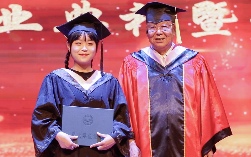 学位授予仪式上,与会的学位委员会委员为获得学位的毕业生代表一一拨穗正冠、颁发学士学位证书,并合影留念。