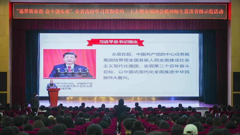 为深入学习贯彻党的二十大和全国两会精神,把全校师生的思想统一到党的二十大精神上来,把力量凝聚到党的二十大和全国两会确定的各项任务上来,4月13日,全省高校学习贯彻党的二十大暨全国两会精神师生巡讲团莅临我校开展宣讲活动,党委副书记、副校长郇东,党委组织部、宣传部全体人员,马克思主义学院全体教师、各学院党政秘书及全校师生代表共计800余人参加了活动。