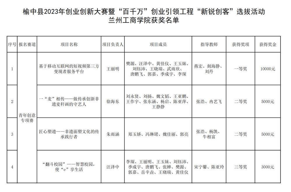 2023年5月25日,由榆中县人社局主办、县就业服务中心、兰州新区汇智达职业培训学校承办的榆中县2023年创业创新大赛暨“百千万”创业引领工程“新锐创客”选拔活动决赛在陇鑫国际大酒店三楼宴会大厅圆满落幕。我校学子包揽 “青年创意专项组”前三名,取得一等奖1项,二等奖2项,三等奖1项的优异成绩。
