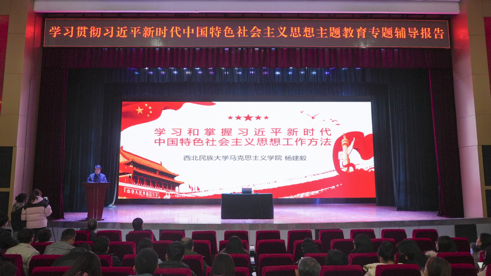 为推动学习贯彻习近平新时代中国特色社会主义思想主题教育走深走实,12月8日下午,西北民族大学马克思主义学院院长杨建毅教授应邀为我校师生作题为《学习和掌握习近平新时代中国特色社会主义思想工作方法》的专题辅导报告。教职员工及学生党员、入党积极分子代表共计800余人聆听了报告。校党委副书记、副校长郇东主持报告会。