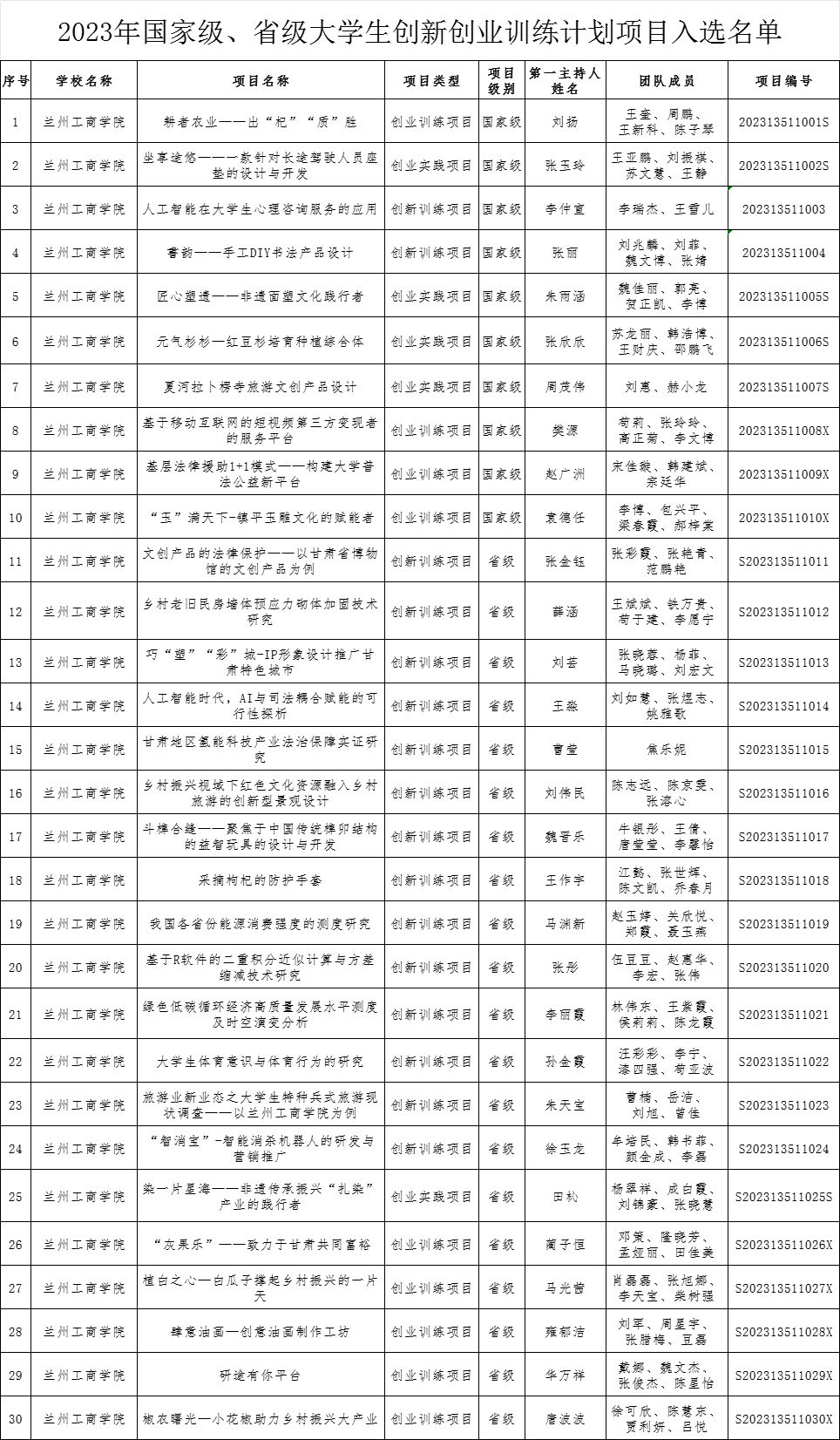 根据《甘肃省教育厅关于公布2023年国家级省级 大学生创新创业训练计划项目名单的通知》(教高司函〔2023〕26号)和《关于组织申报2023年校级大学生创新创业训练计划项目的通知》(兰工商大创发〔2023〕3号)文件精神,我校共有30个项目入选2023年国家级、省级大学生创新创业训练计划项目,其中国家级10项,省级20项。具体包括创新训练项目16项,创业训练项目9项,创业实践项目5项。