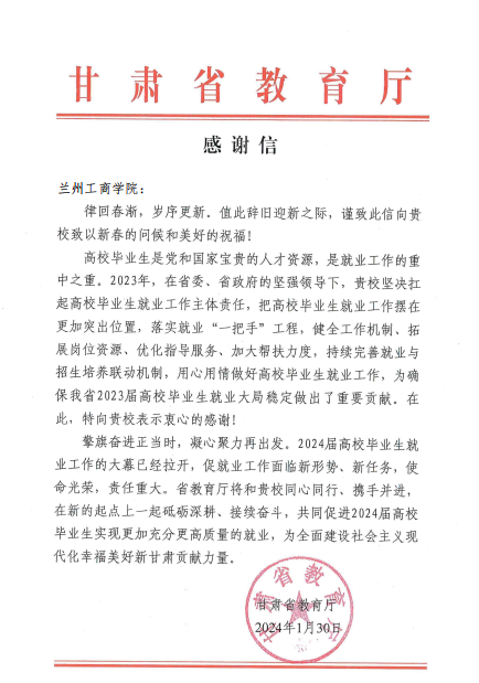 近日,学校收到来自甘肃省教育厅的感谢信,对我校2023届毕业生就业工作举措及取得的成效给予了充分肯定。
