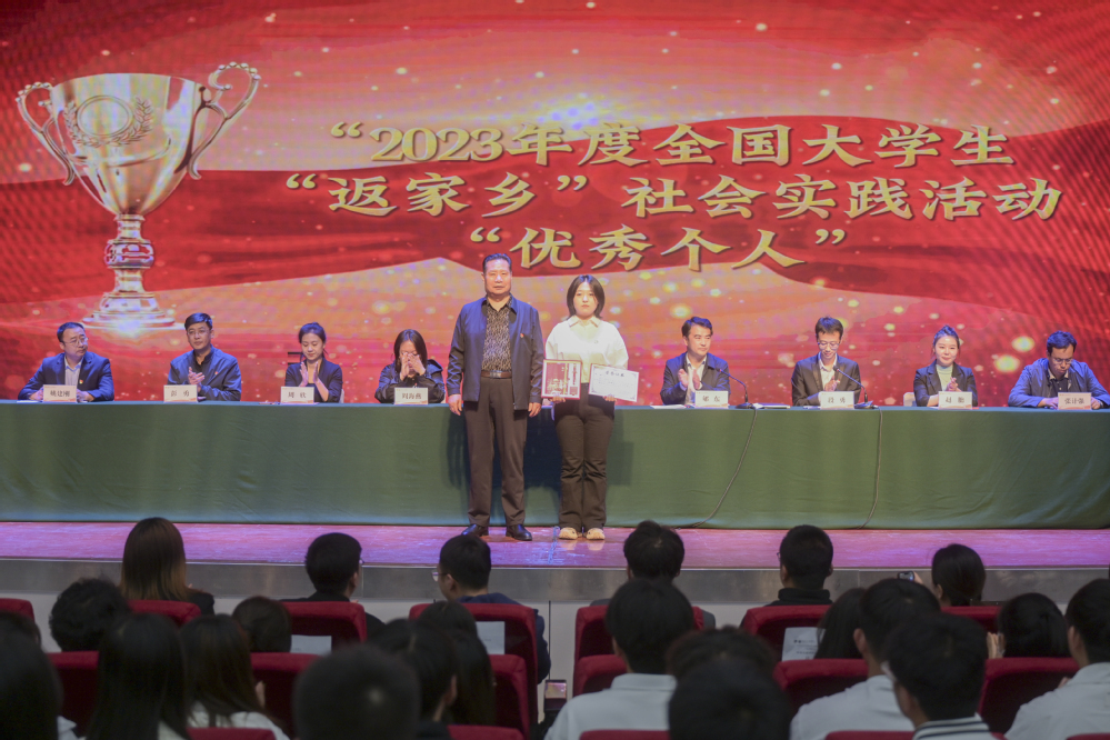 大会在雄壮的国歌声中拉开帷幕。郇东宣读了团中央关于2023年度全国大学生“返家乡”社会实践活动先进个人的表扬信,宣读了团省委和学校团委的表彰文件,并向受到表彰的集体和个人表示祝贺。随后,对获得表彰的集体和个人颁发了荣誉证书和奖品。