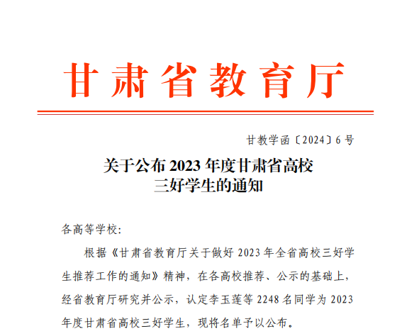 日前,省教育厅印发了《关于公布2023年度甘肃省高校三好学生的通知》(甘教学函〔2024〕6号),我校黄耀琳等51名同学获2023年度甘肃省高校“三好学生”荣誉称号。