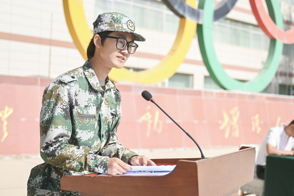 “优秀军训标兵”代表韩宏伟同学上台发言,他分享了十四天军训中所感所想、所获所得,并表示要把军训期间养成的良好习惯和作风延伸到今后的学习生活中去,以昂扬的斗志、坚定的信念,去迎接未来的每一个挑战。