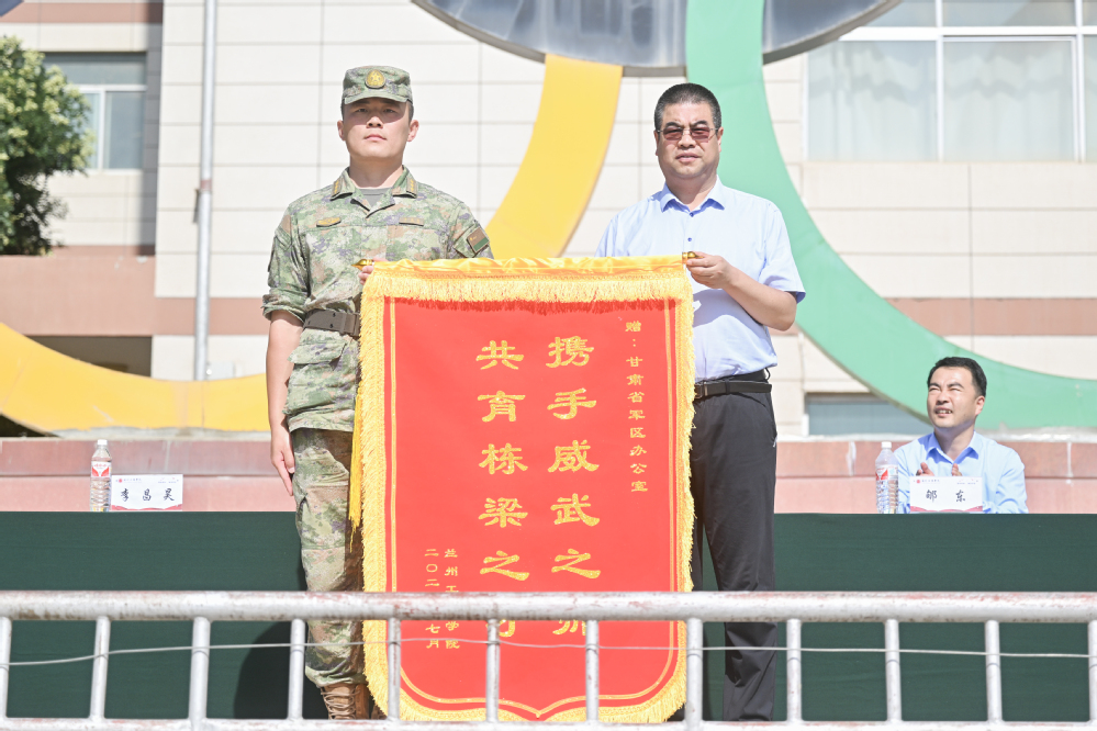 常务副校长马义哈代表学校为承训部队赠送锦旗,并向在本次军训付出的辛勤努力的全体教官表示衷心感谢。