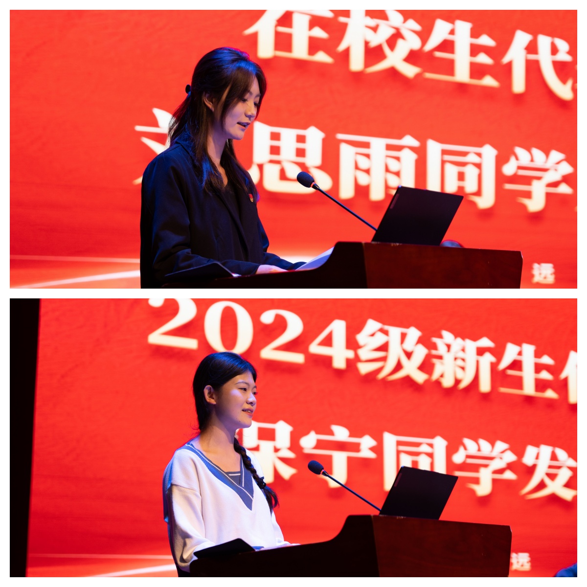 会上,学院教师史安玲教授代表全院教师发言。史教授欢迎各位新生加入经济学院,鼓励新同学在大学的学习生活中积极勤奋、团结协作、同窗互助、百花齐放,激励新生们在新的征程中勇敢前行,为实现自己的梦想而努力奋斗。接着,经济统计学2102班刘思雨同学代表在校生发言。她回顾了自己大学的成长经历和心路历程,同时也分享了大学期间的收获,建议新同学做好规划,知行合一,在学习上自律勤奋,在实践中历练自我,成栋梁之材,为社会主义建设贡献自己的力量。经济统计学2401班保宁同学代表2024级新生发言。她首先向全院教师表达了感谢,回顾了高中学习历程,同时期待在未来的大学时光里,能在广阔的舞台上发现自我、展现自我、突破自我、追求自我,践行“厚德载物、博学济世”的校训,努力成长为对国家建设有贡献的人才。