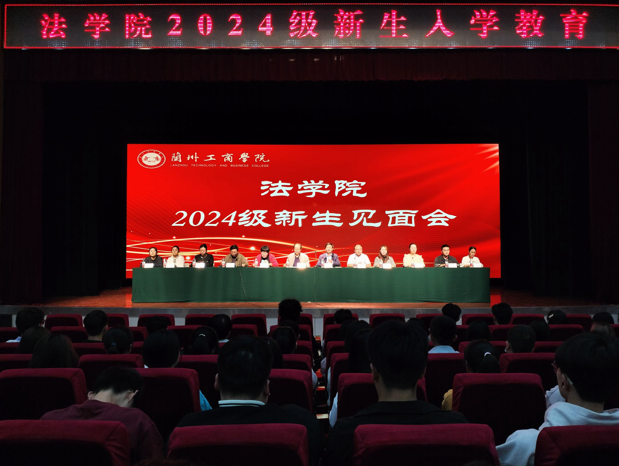9⽉12⽇下午, 法学院2024级新生见面会在学术报告厅正厅顺利召开。法学院院⻓李玉璧,教学院长郑天锋,教学院长葛欣,行政院长刘涛,党委副书记赵朏,行政院长助理海文涛,教学院长助理宋蕾,学院团总支书记马子珺,2024级辅导员及2024级全体新生参加见面会。见面会由行政院长助理海文涛主持。