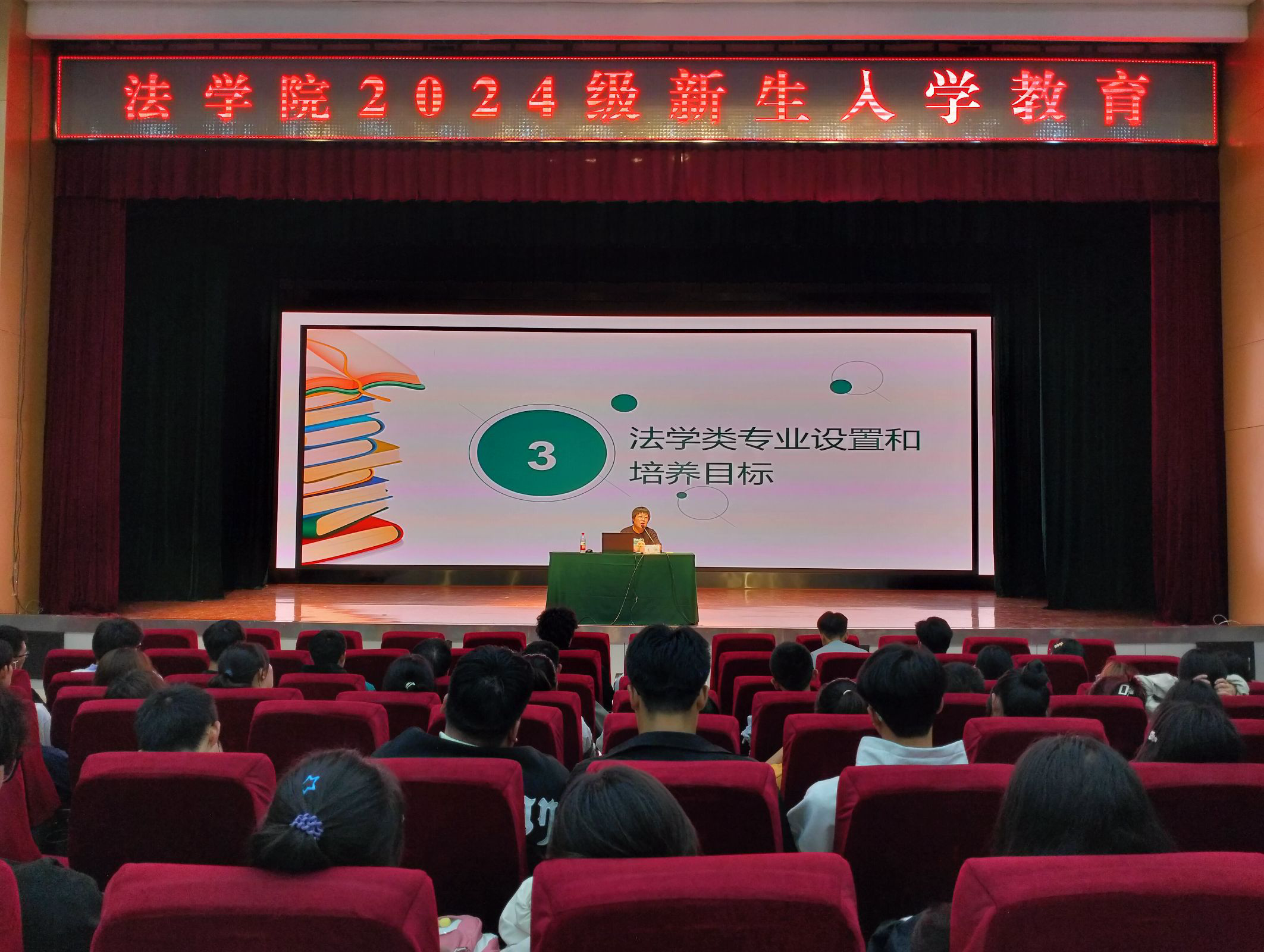 随后,李玉壁院长代表全院师生向2024级新同学表示欢迎并向同学们介绍了学院的历史沿革、师资力量及学院发展取得的成果。李院长对新生提出四点期望:首先是热爱,因为有爱才有信任,有信任才会产生认同感进而形成归属感。要热爱自己的专业,只有热爱专业才能激发学习的动力。其次是规划,明确目标定方向,合理规划并为之努力。其三是勤奋,勤奋是万事之基础,是开启成功大门的钥匙。要多读书、会读书且爱读书。最后是健康,要积极投身于身体锻炼,努力养成良好生活习惯。李院长鼓励新同学,感受优美环境,沉浸浓厚氛围,结识良师益友,怀揣梦想,脚踏实地,法学院与同学们一路同行。