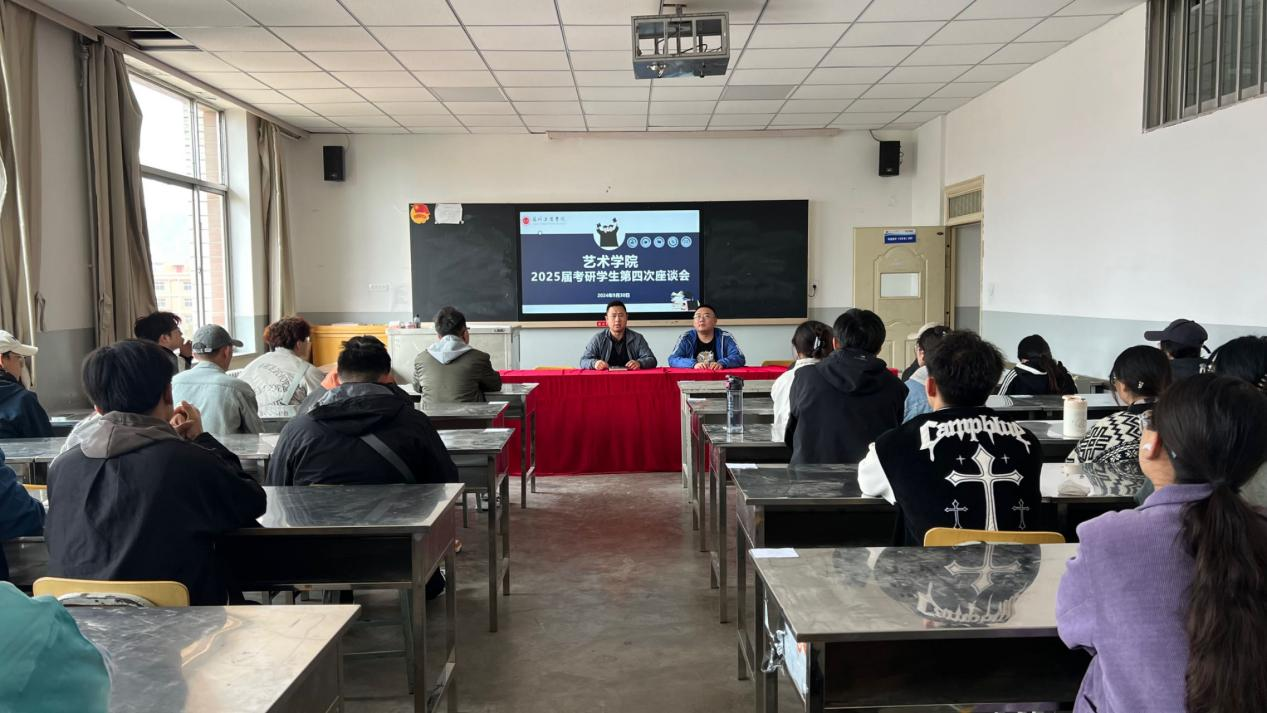 近日,艺术学院召开了2025届考研学生第四次座谈会,本次会议主要针对2025届考研学生报名工作,旨在帮助学生深入了解最新的考研政策,掌握报考技巧,提高学生报考的精准度。学院领导班子成员和毕业班辅导员参加了会议,会议由学院行政院长张德红主持。