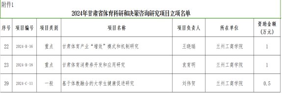 近日,甘肃省体育局公布了2024年甘肃省体育科研和决策咨询研究项目立项名单,我校体育教学部共有3个项目获批立项,其中重点项目2项,一般项目1项。