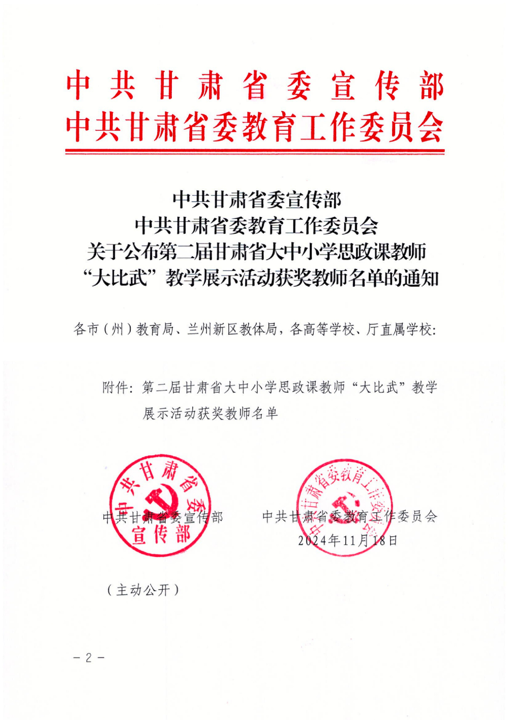 近日,甘肃省教育厅公布了第二届甘肃省大中小学思政课教师“大比武”教学展示活动最终结果,我校参赛教师获得一等奖一项、三等奖两项的好成绩。