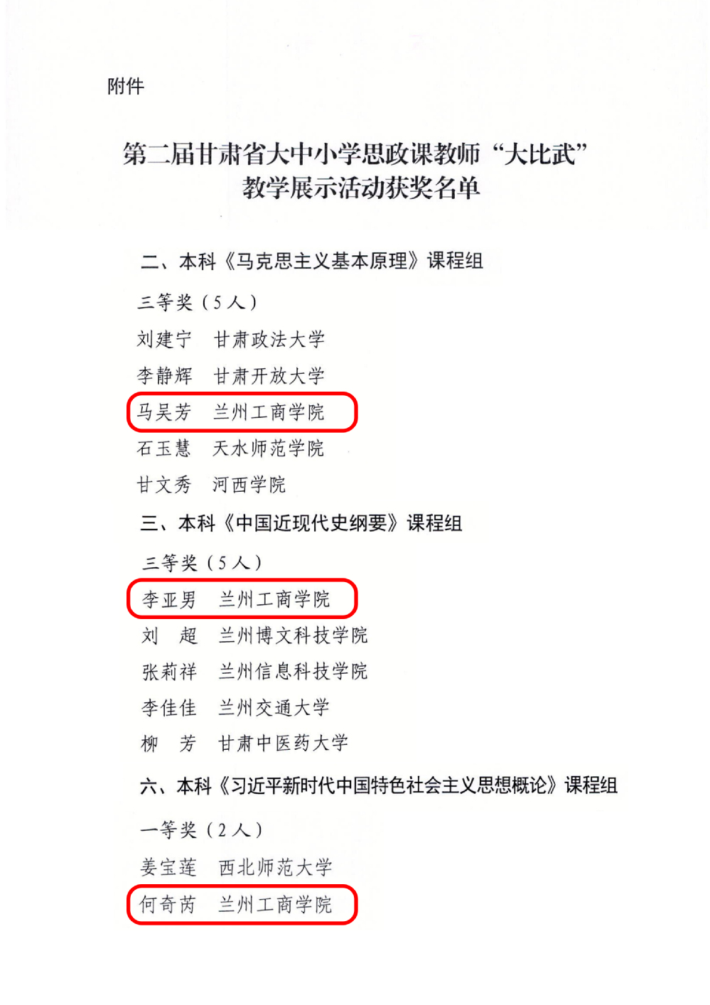 甘肃省第二届大中小学思政课教师“大比武”教学展示活动由中共甘肃省委宣传部、中共甘肃省委教育工委举办。经过前期遴选推荐和网络评审,来自全省大中小学的186名思政课教师脱颖而出,同台竞技。经过评选,我校马克思主义学院教师何奇芮获得本科《习近平新时代中国特色社会主义思想概论》课程组一等奖,李亚男获得本科《中国近现代史纲要》课程组三等奖,马吴芳获得本科《马克思主义基本原理》课程组三等奖。