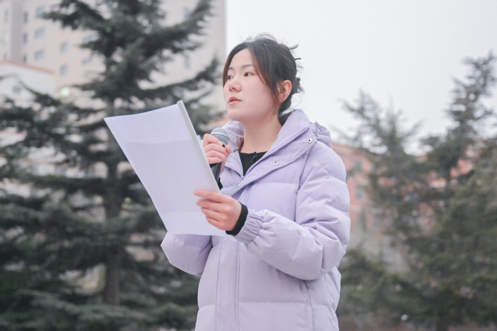 在升旗仪式上,马克思主义学院教师周雪梅代表全体教师进行了发言。她深情回顾了“一二·九”运动中青年学生们为了挽救民族危亡,挺身而出、顽强抗争的英勇事迹。她号召全体同学要铭记历史,传承和发扬“一二·九”运动中青年学生的爱国精神和责任感,在新时代中努力学习、勇于担当,将个人的理想追求融入到国家和民族的事业中。