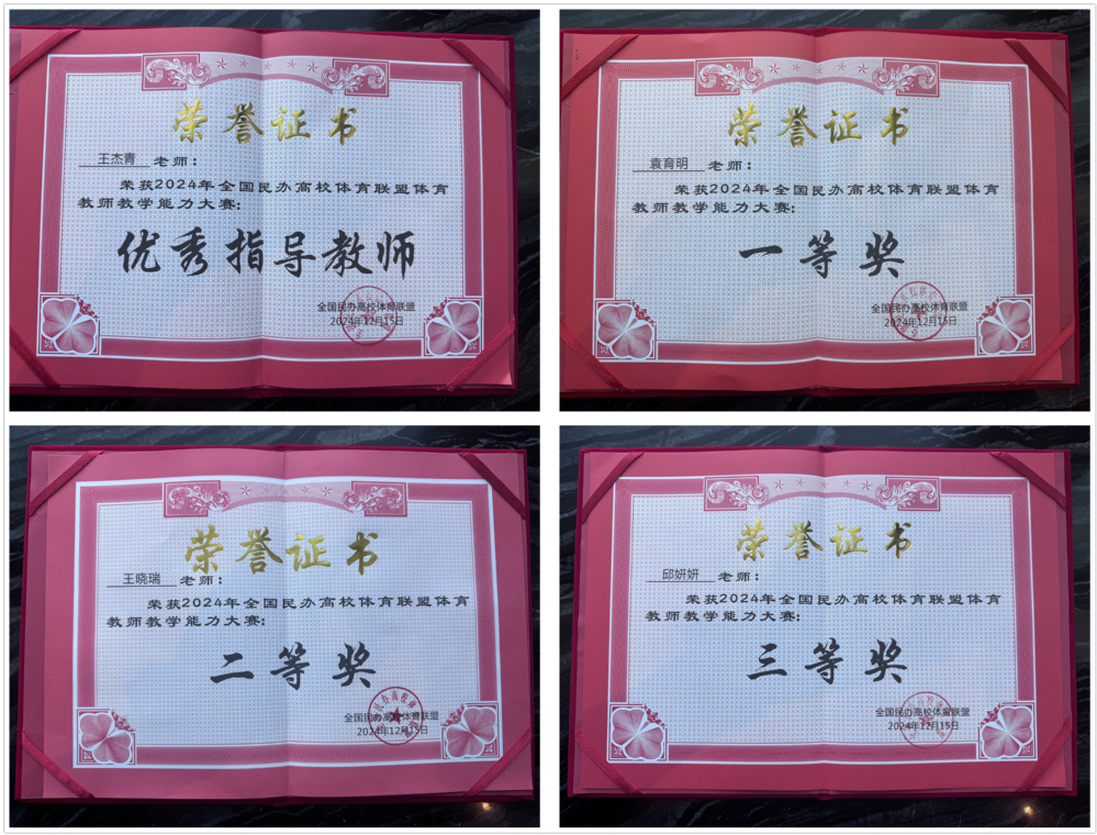 我校体育教学部的教师们在此次大赛中表现突出,荣获多项荣誉。袁育明老师凭借出色的教学能力和专业素养,荣获讲课大赛一等奖; 王晓瑞老师荣获二等奖;邱妍妍老师荣获三等奖;王杰青老师则荣获优秀指导老师荣誉称号。同时,我校还获得了讲课比赛团体总分三等奖的佳绩。