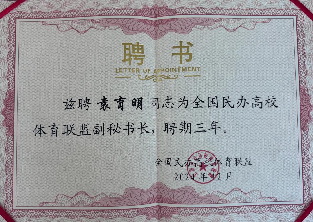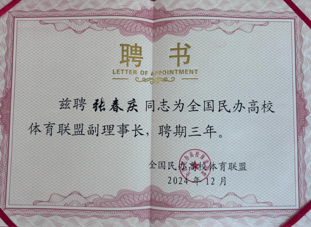 大会审议通过了全国民办高校体育联盟《章程》,我校当选为全国民办高校体育联盟副理事长单位,副校长张春庆受聘为全国民办高校体育联盟副理事长,体育教学部副主任袁育明当选为全国民办高校体育联盟副秘书长。这一荣誉将进一步推动我校体育教育事业的发展,为学校体育工作的高质量内涵式发展添砖加瓦。