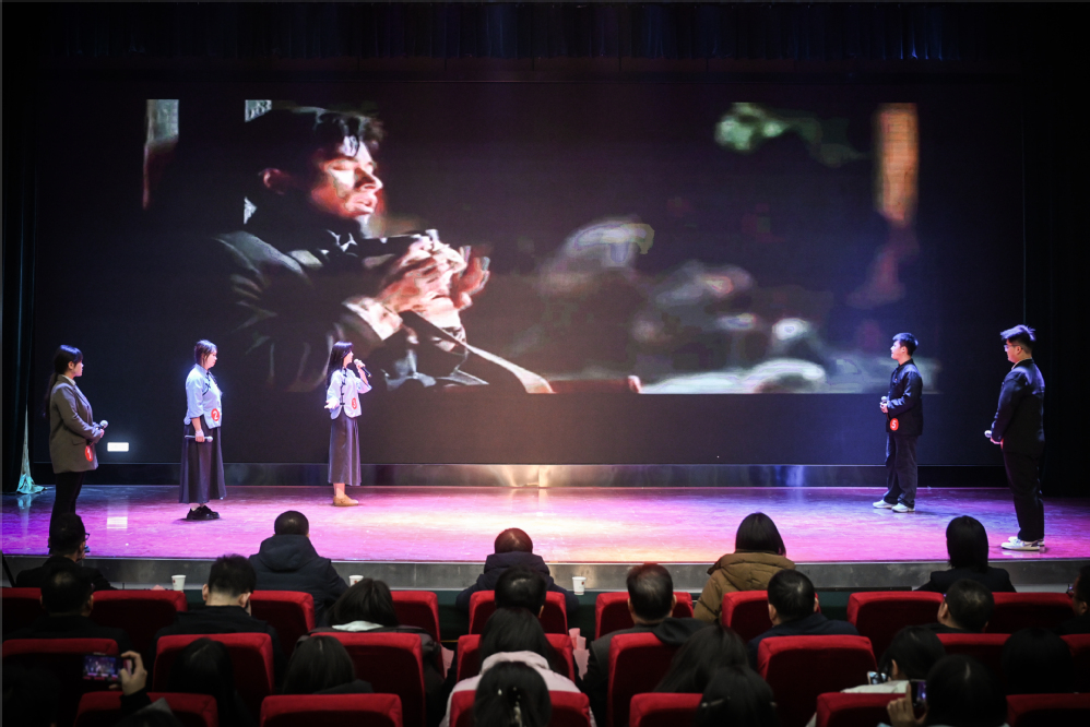决赛现场,《建军大业》《觉醒年代》《我的1919》《百团大战》《建国大业》《建党伟业》等经典影视作品在舞台得到了精彩呈现。参赛团队成员通过充沛的情感和富有张力的声音,深刻地刻画出了无数革命先辈、仁人志士为中华民族伟大复兴所作出的重大贡献及展现出的伟大精神,选手们根据自身对影视作品的理解,诉说着一段段激动人心的红色故事,用最真切的情感打动了台下的听众,让红色精神真正地走进了学生的心里,赢得了在场师生的阵阵掌声。